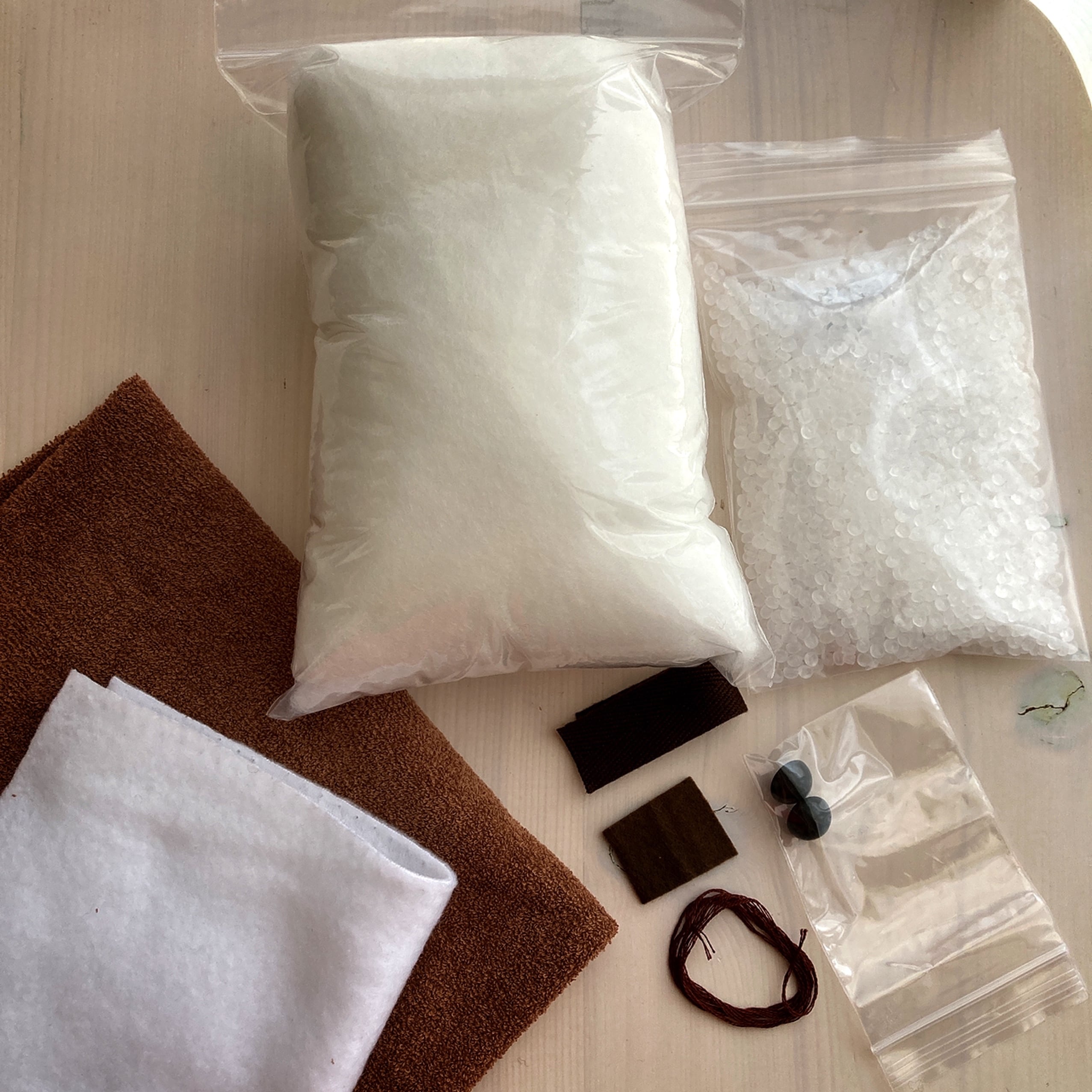 キット内容:型紙/生地(茶色タオル生地・白フリース)/鼻用フエルト/目玉ボタン/刺繍糸(ひげ用)/綿/ペレット/補強用綿テープ